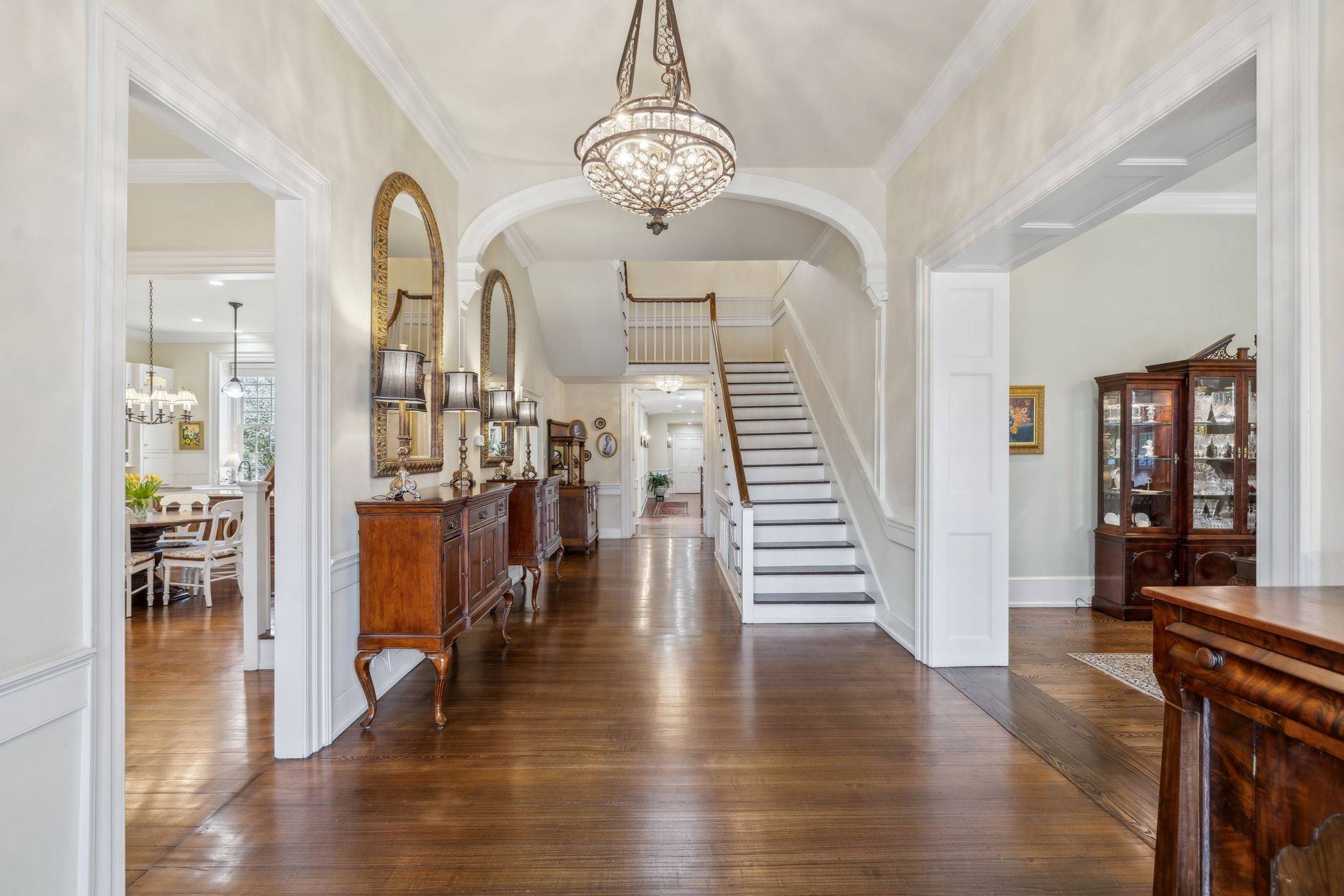 becoming even more beautiful and refined. The Federal-style home opens to a stunning foyer featuring 12 ft. soaring ceilings and an elegant handcrafted stair case with original poplar steps and oak railing. Original 1” thick tongue-in-groove ash floors grace the interior which was fully renovated by Tallman Enterprises and includes: Primary-on-the-main with luxurious ensuite featuring a heated Carrera marble floor, bidet, large air jet soaking tub, spacious walk-in marble shower with heated towel bar, custom walnut vanity and cabinets, and custom designed walk-in closet. The open and naturally lit chef's kitchen features custom cabinetry, subzero refrigerator, Dacor six burner gas range, warming drawer, and new wall oven and dishwasher. The home also features a spacious 28x21' den with an impressive stone wood-burning fireplace (2016), an attached 2.5 car garage includes additional storage and private driveway (replaced 2025), separate fully renovated (2021) walk-in guest house with complete kitchen and attached garage. A beach-entry L-shaped swimming pool (2013) compliments beautifully landscaped front, side and backyards which include fountains and a charming traditional English garden. The home has seven fireplaces and is handicap-accessible. GUEST